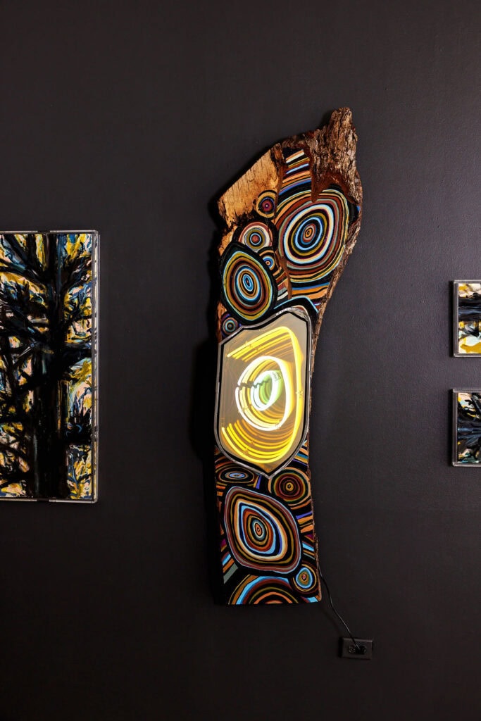 The idea of adding these sculptural elements came to her in 2020 during the lockdown when she spent 6 weeks in the Rocky Mountains hiking with her dog. As paper is a byproduct of wood it felt like the perfect material when using wood as a canvas. It sits on the line between a natural material and an industrial product as it is not in its raw, organic form but is derived from nature. This blending of the lines between the natural and urban worlds and history and modernity is what Christi’s artwork is all about.