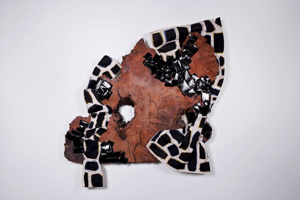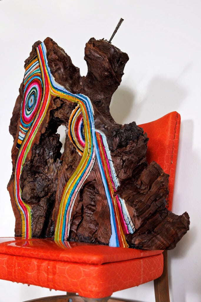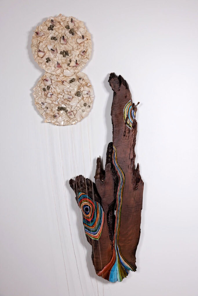 A more recent addition to her artistic exploration through wood is the use of paper. Christi describes, “I work in both 2D and 3D, blending traditional painting with sculptural elements. For my redwood sculptures, I incorporate hand-painted canvas, reshaping it into layered, dimensional forms. Some pieces combine paint, paper, nails, and resin to create depth and texture.”