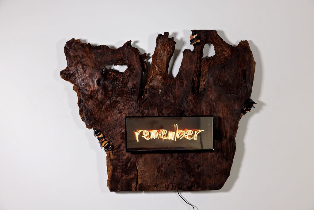 One of the most stunning parts of this exhibition is the visual and energetic presence of the old-growth redwood at the heart of her sculptures. This is an intentional and considered choice of material as it adds an emotional and narrative depth to her artwork.