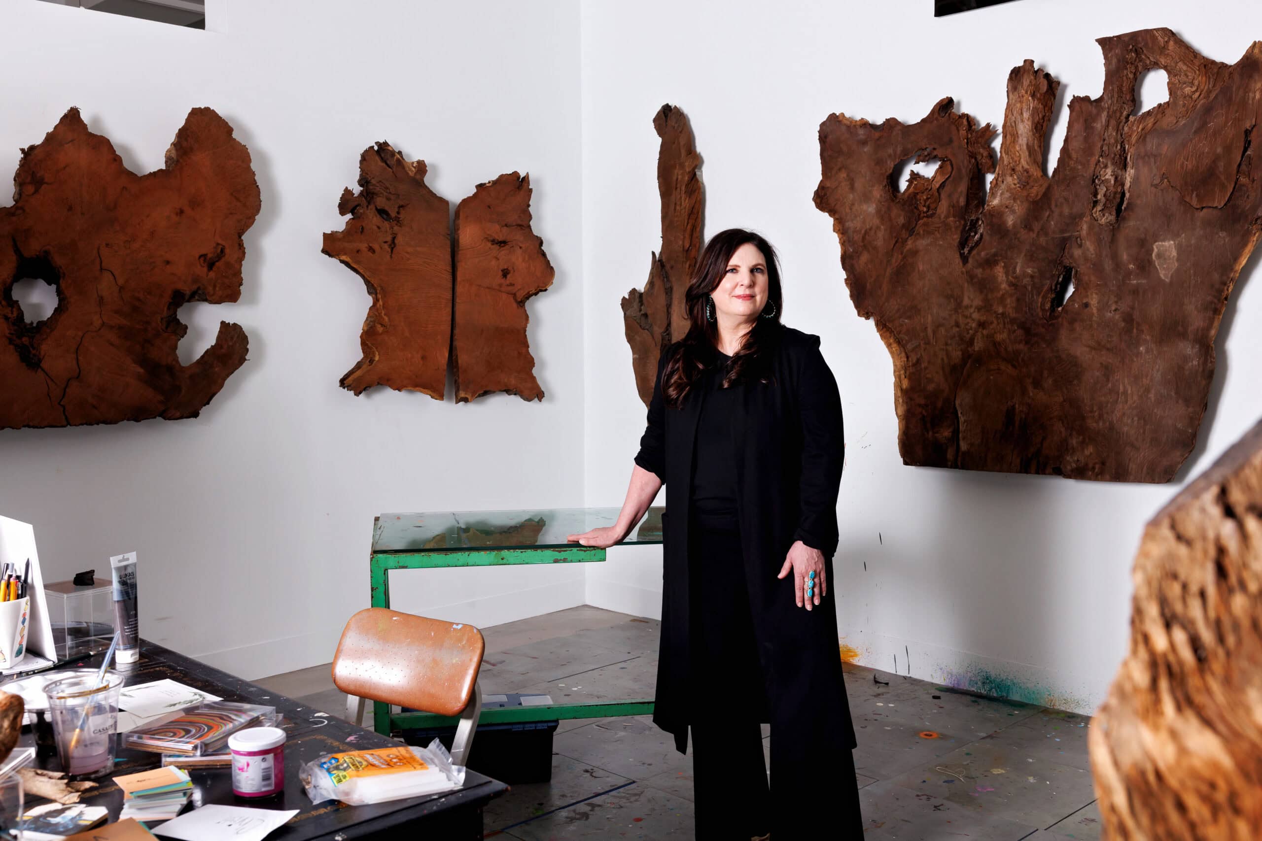 Christi chose old-growth redwood specifically for this show exploring the renewal and transformation that takes place at the intersection between urban life and the natural world. Their history adds such symbolism and narrative intrigue.