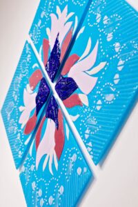 My glass art mural “ALL THE FEELS” is a piece which explores balance and harmony. It’s a balance of fluidity and structure; of warm, bold furls and cool, delicate depths. For me, that’s what friendships are all about too.