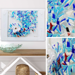It was my cluttered mind that inspired this glass art mural “THE CLEARING.” I realized that by decluttering, it helped me welcome productivity, focus and most importantly, calmness into my daily life. The white flower is a representation of that beautiful calmness once it had a good clearing.