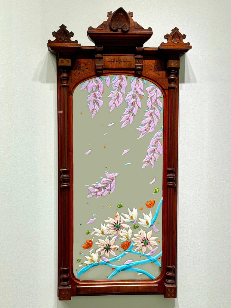This vintage mirror and glass art fusion represents sitting by the lake as I have done many times on family trips. The mirror replicates the surface of the water while I used colored glass pieces to create flowers dancing in the wind. Just looking at it, I can almost feel the wind blowing across my face as the flowers dance around me.